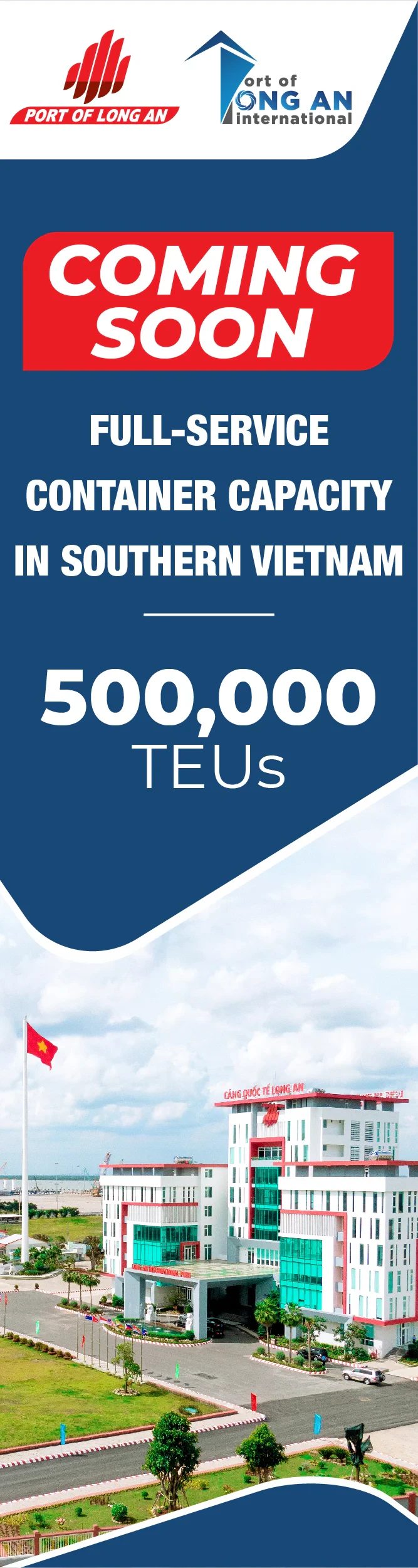 Long An International Port was established on December 24, 2015 through a 400 million USD investment by the Dong Tam Group. Its full-service container capability is scheduled to go live by Q2 2023. Since 2015, the port has been handling bulk cargo providing warehousing (including bonded), distribution, customs brokerage, domestic transportation, and international freight forwarding.